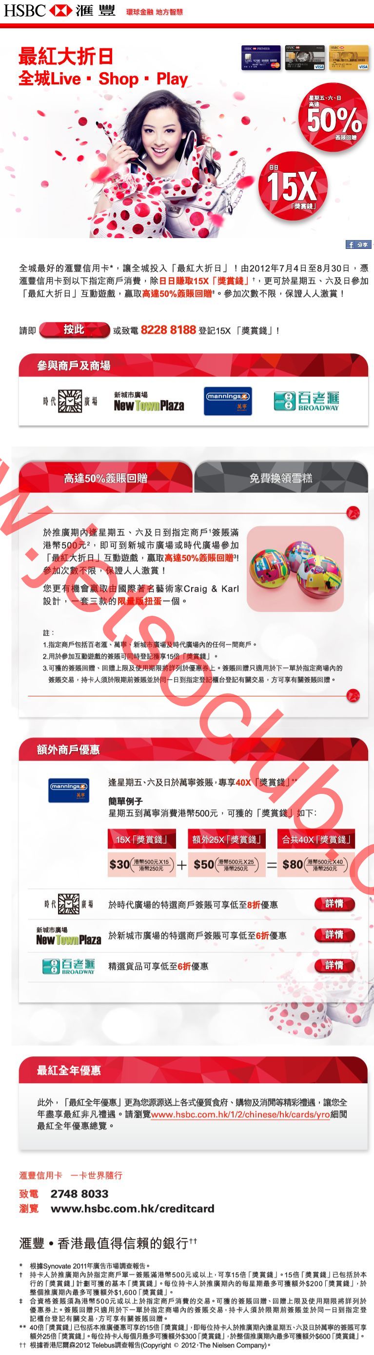 匯豐信用卡:最紅大折日 15X「獎賞錢」及高達50%簽賬回贈 - 萬寧/百老匯/時代廣場/新城市廣場(4/7-30/8)
