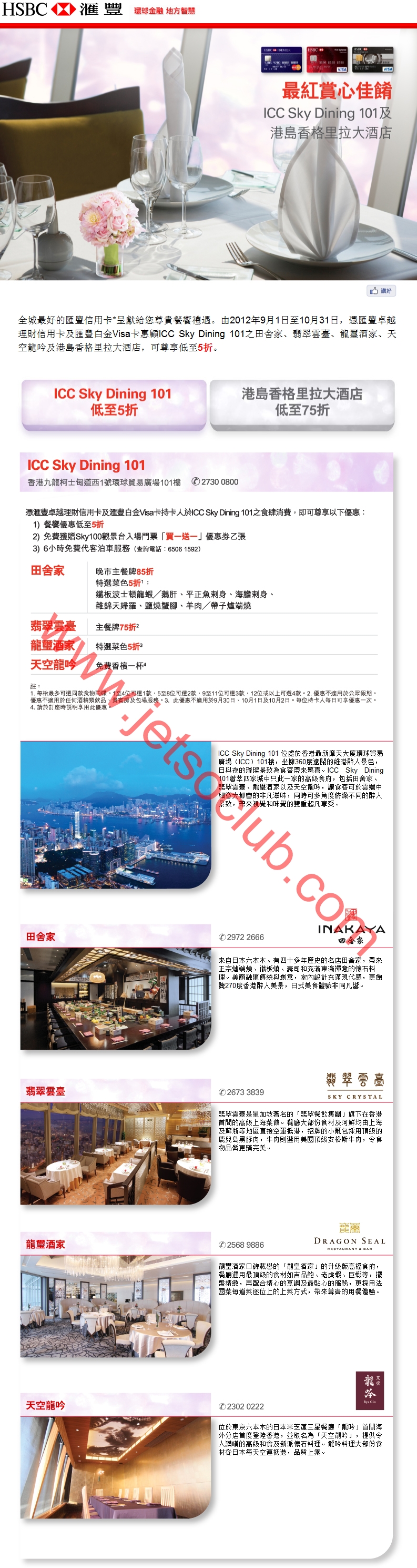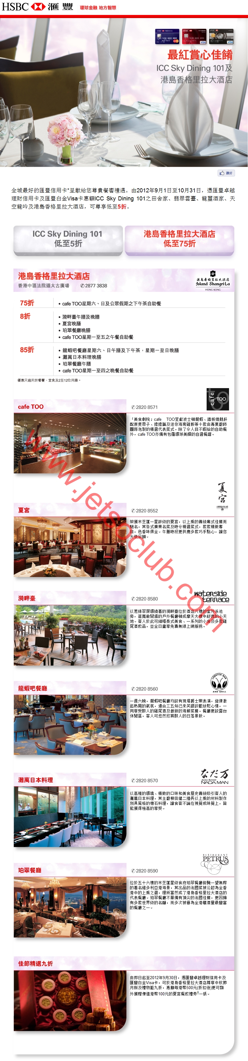 匯豐信用卡:港島香格里拉大酒店及ICC Sky Dining 101 餐飲低至5折(至31/10)