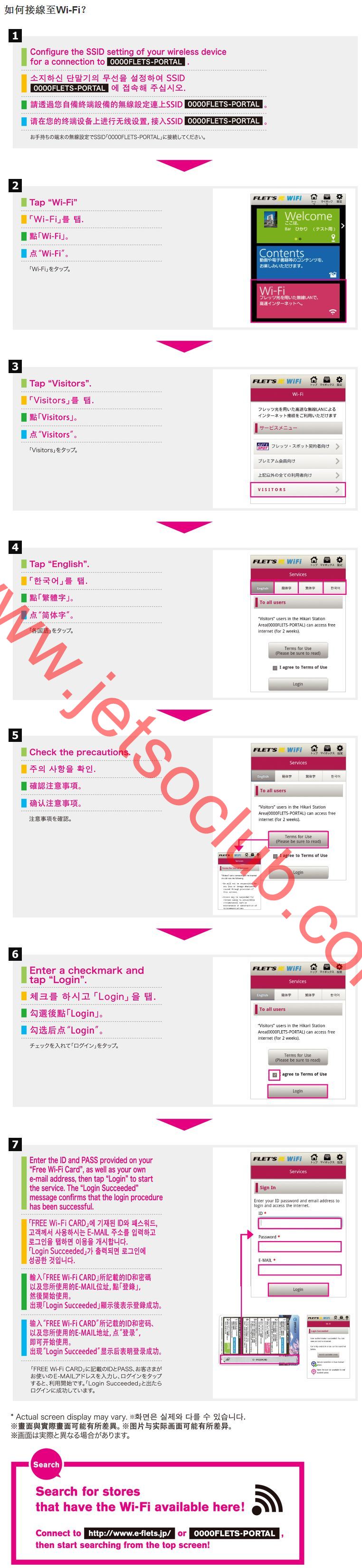 只須在機場或旅遊資訊中心等地方的櫃檯索取專用上網卡(免費Wi-Fi上網卡)便可。遊客出示護照便可以獲取上網卡。卡上寫了登入所需的帳號及密碼,於接收到NTT東日本Wi-Fi訊號(0000FLETS-PORTAL)的接駁點,按照指示輸入便OK。