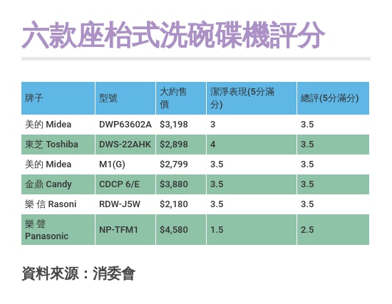 消委會公布有關洗碗碟機測試。在六款較適合香港細小家居的坐枱式洗碗碟機中,內地家電品牌「美的」兩款產品,所得評分均較日本品牌樂聲牌為高,但售價卻低三至四成;當中潔淨表現評分,樂聲牌得分在六款產品中最低。