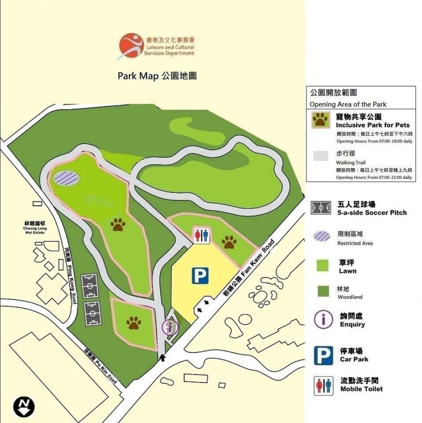 明日起開放的設施包括位於公園北端的「寵物共享公園」、步行徑和24小時營運的收費公眾停車場。開放後,「寵物共享公園」開放時間為早上七時至下午六時,而步行徑開放時間為早上七時至晚上九時。